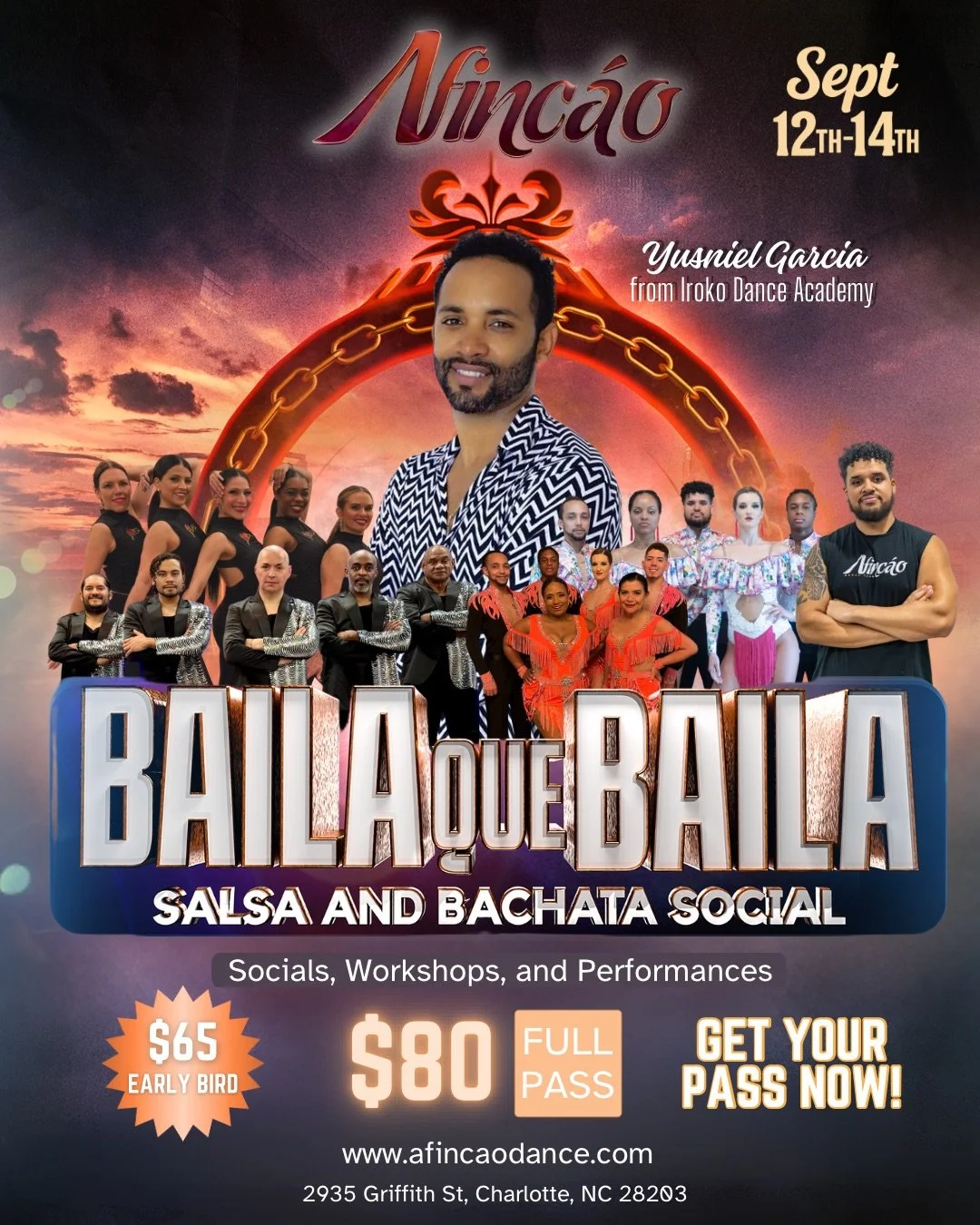 Afincao’s Quarterly Social where all of the best dancers from Charlotte and the surrounding areas meet for an incredible night of dancing. For each Baila Que Baila we bring in a guest instructor/performer to host workshops and shows. Stay tuned for updates on who we are bringing.